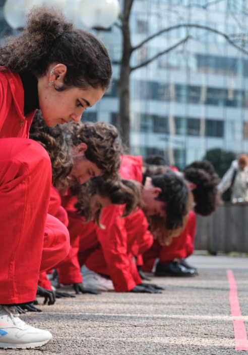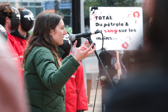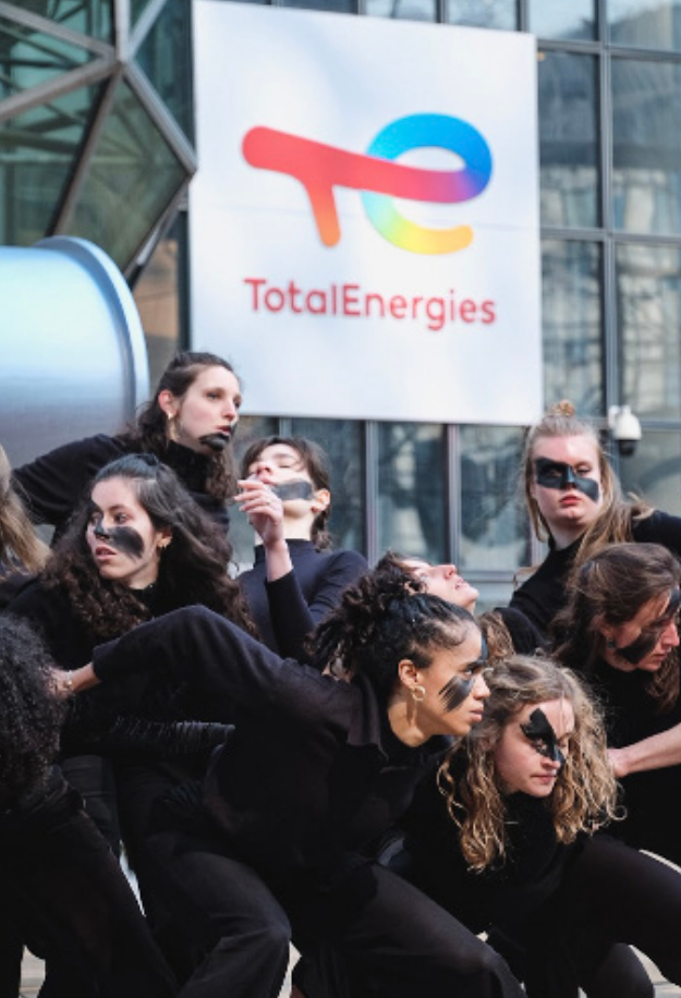 22 mars 2021, 30 danseurs performent devant le siège de Total organisée par Camille Etienne. Activistes et artistes sont réunit pour dénoncer la construction du plus grand oléoduc chauffé au monde en Ouganda et Kenya : EACOP.